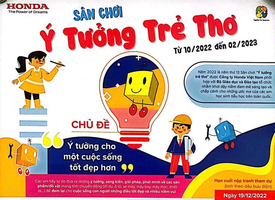 Công ty Honda Việt Nam phối hợp cùng Bộ Giáo dục và Đào tạo tổ chức cuộc thi vẽ tranh toàn quốc "Sân chơi Ý tưởng trẻ thơ lần thứ 13". Đây chính là cơ hội để những “nhà phát minh tí hon” cùng tranh tài và chia sẻ ước mơ của mình thông qua những bức tranh mô hình sáng tạo của bản thân. Sân chơi Ý tưởng trẻ thơ được phát động, triển khai rộng khắp đến các Trường tiểu học trong cả nước trong 3 tháng (từ ngày 12/10 đến hết ngày 19/12/2022). Ban tổ chức đã nhận về hơn 500 nghìn ý tưởng. Sự gia tăng về số lượng các bài dự thi qua các năm đã chứng tỏ được sức hút và giá trị nhân văn mà sân chơi mang lại cho các em học sinh.