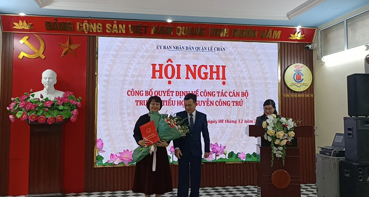 Tại Hội nghị này, đ/c Nguyễn Thị Thanh Thủy - Trưởng Phòng Nội vụ quận đã điều hành Hội nghị, công bố Quyết định của Chủ tịch UBND quận Lê Chân về việc bổ nhiệm đ/c Lê Thị Thu Hiền - nguyên Phó Hiệu trưởng Trường Tiểu học Nguyễn Văn Tố nhận chức vụ Hiệu trưởng Trường Tiểu học Nguyễn Công Trứ kể từ ngày 08/12/2022.